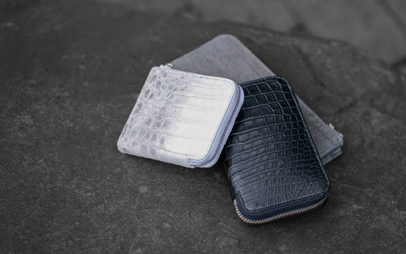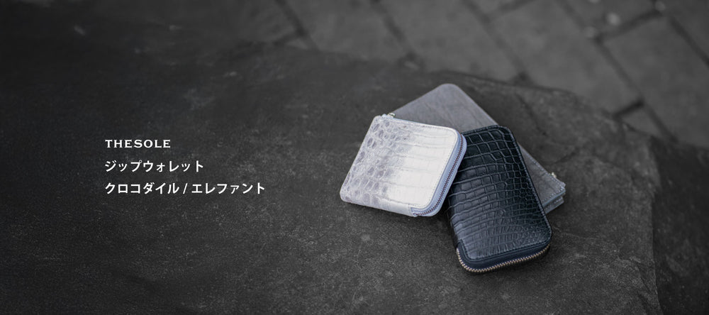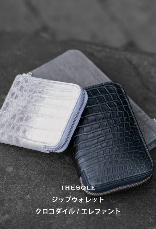 THE SOLEで人気のジップウォレットに、新たに象革とクロコダイルが登場しました。天然の表情と使うほど深まる風合いが魅力で、どちらも熟練の職人が手作業で仕立てた逸品。必要最小限を美しく収める大人のウォレットです。