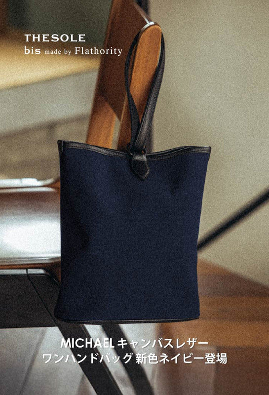 ブラックで高い支持を集める軽量ワンハンドバッグ、THE SOLE bis made by Flathorityの「MICHAEL」にネイビーが登場しました。旧式シャトル織機で織ったキャンバスと防水レザーを組み合わせ、撥水性と堅牢性、使いやすさを両立。500mLボトルが収まる実用サイズです。