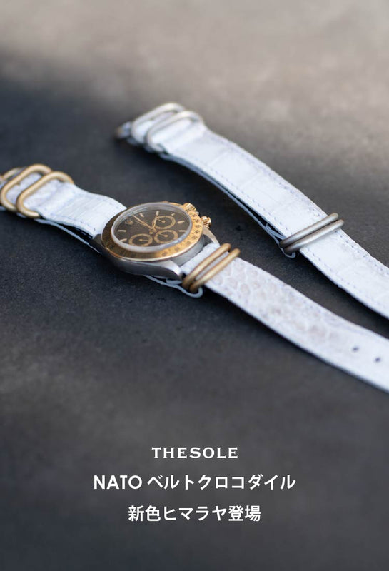 THE SOLEのNATOベルトに新色「ヒマラヤ」が登場します。通常はナイロンで作られるNATOベルトを、クロコダイルレザーで贅沢に再構築。マット仕上げの金具や、肌当たりに配慮した裏面のオーストリッチなど、細部まで上質感を追求しています。